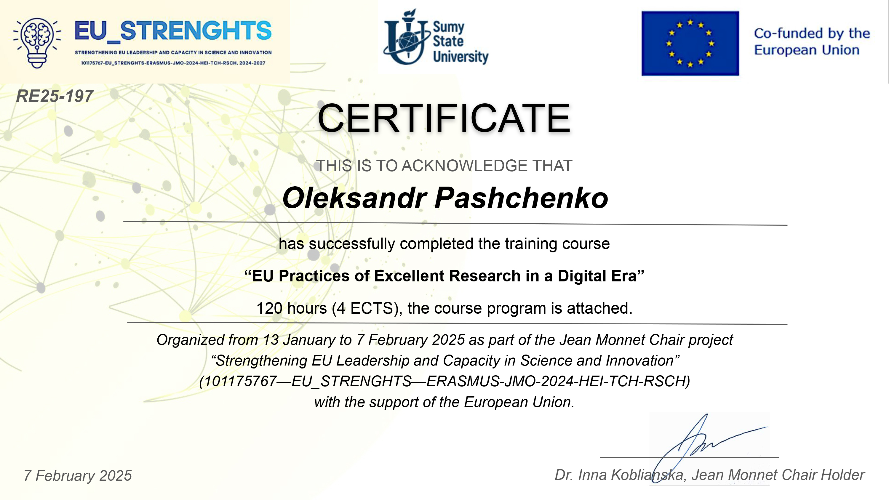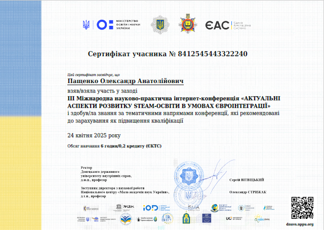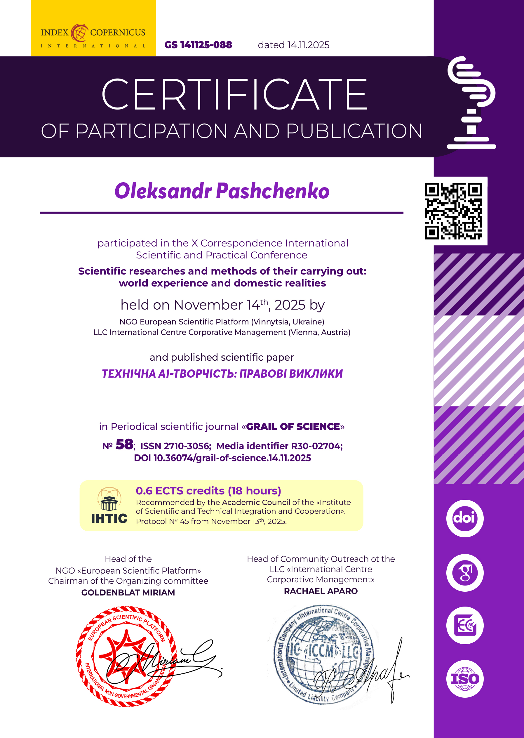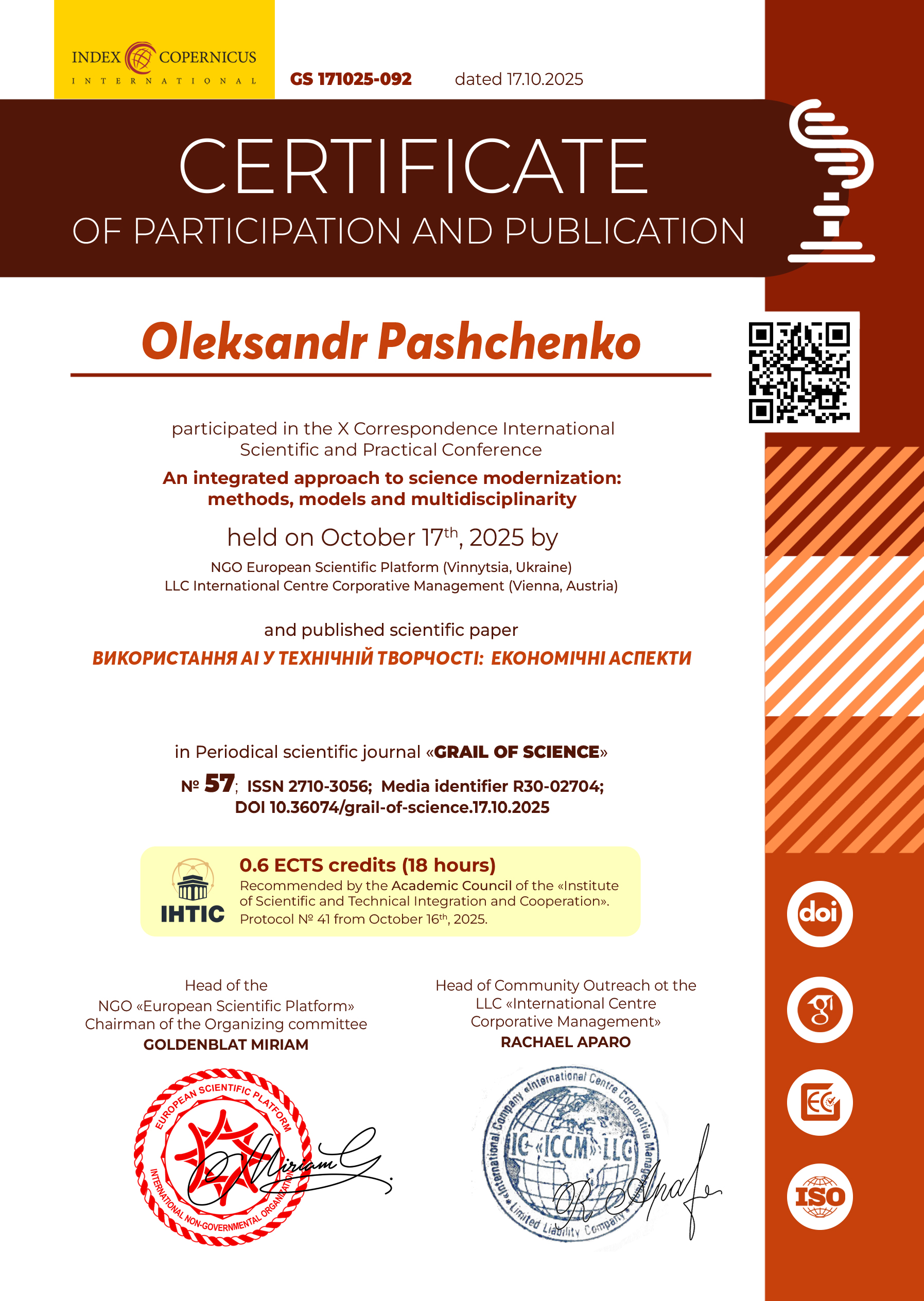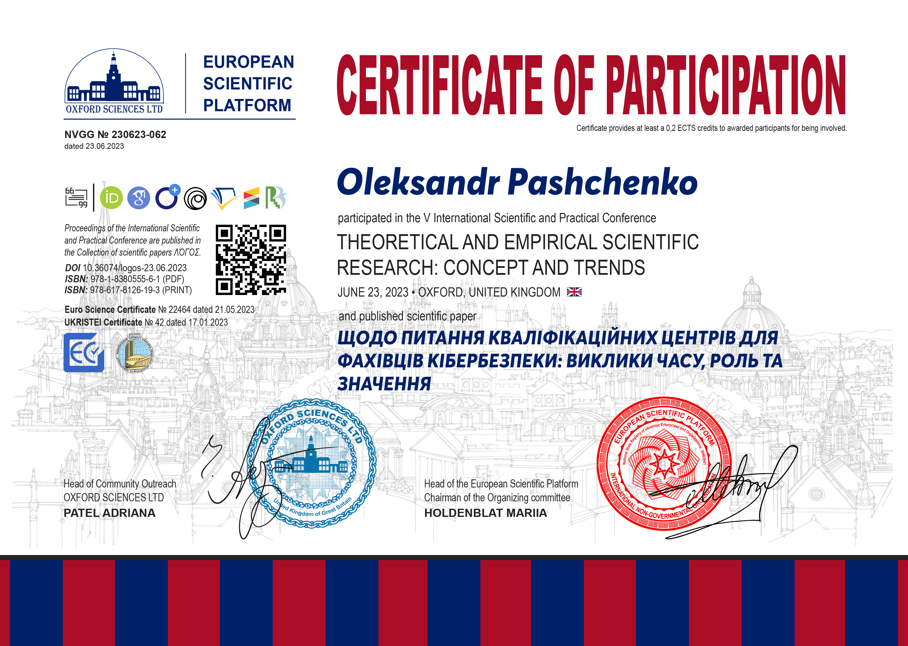 5. NGO Européen Scientific Plotform (Vnnytsio. Heroine) LLC Internotionol Centre Corporative Monogement (Vienno. Austria); Сертифікат GS170223-167, 17.02.2023; тема: «SCIENTIFIC RESEARCHES AND METHODS OF THEIR CARRYING OUT: WORLD EXPERIENCE AND DOMESTIC REALITIES»; кількість кредитів – 0,3 (9 годин).