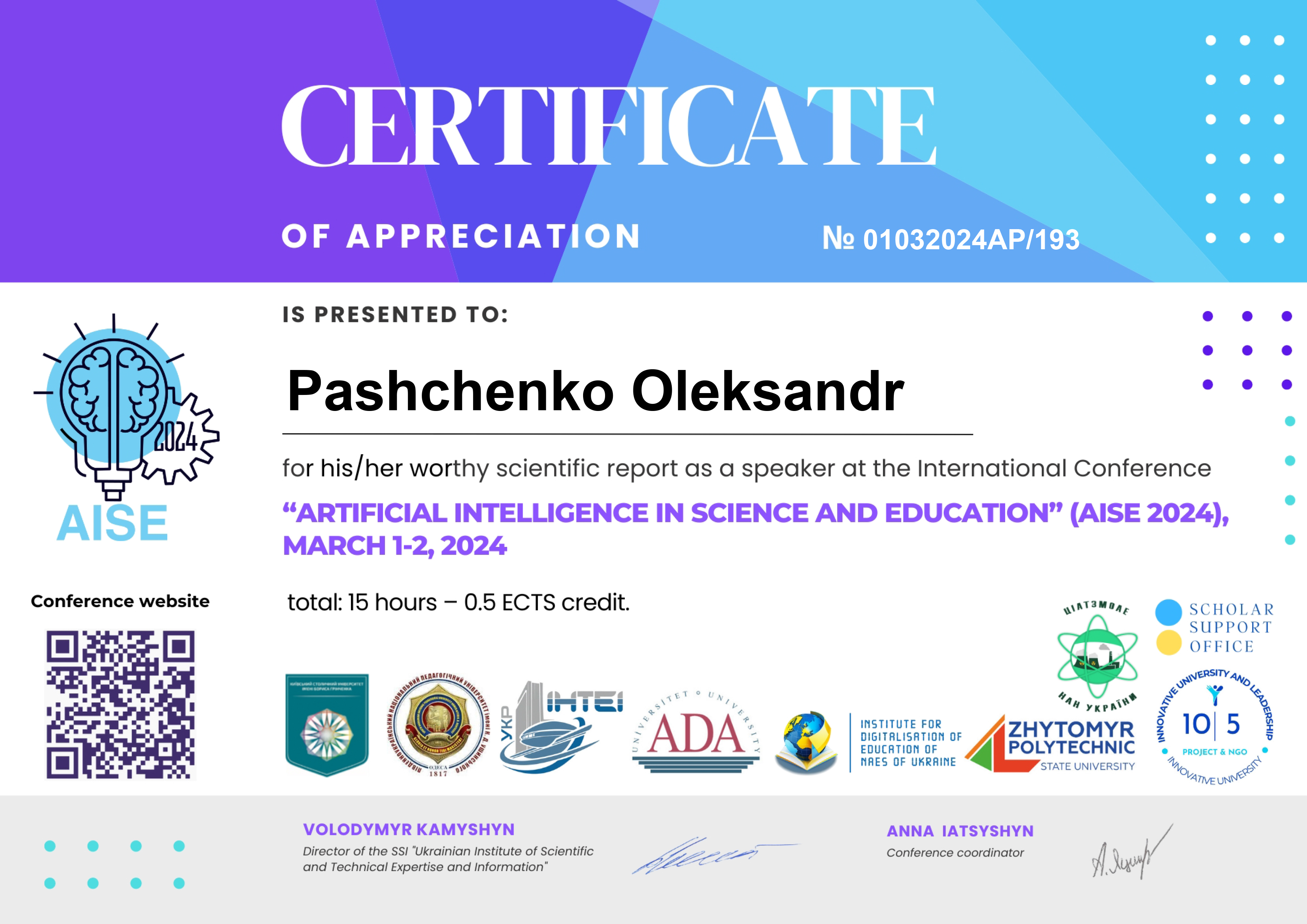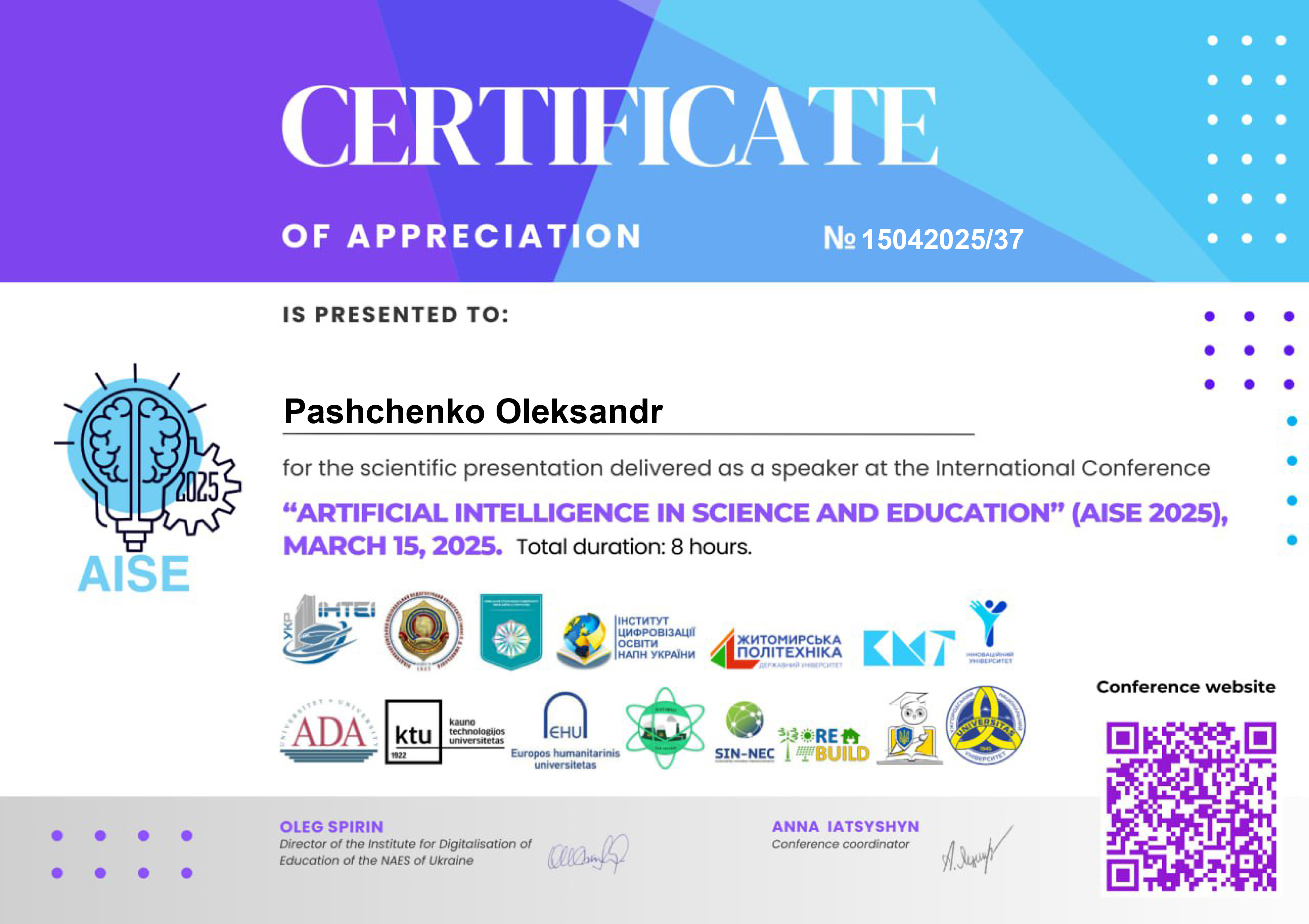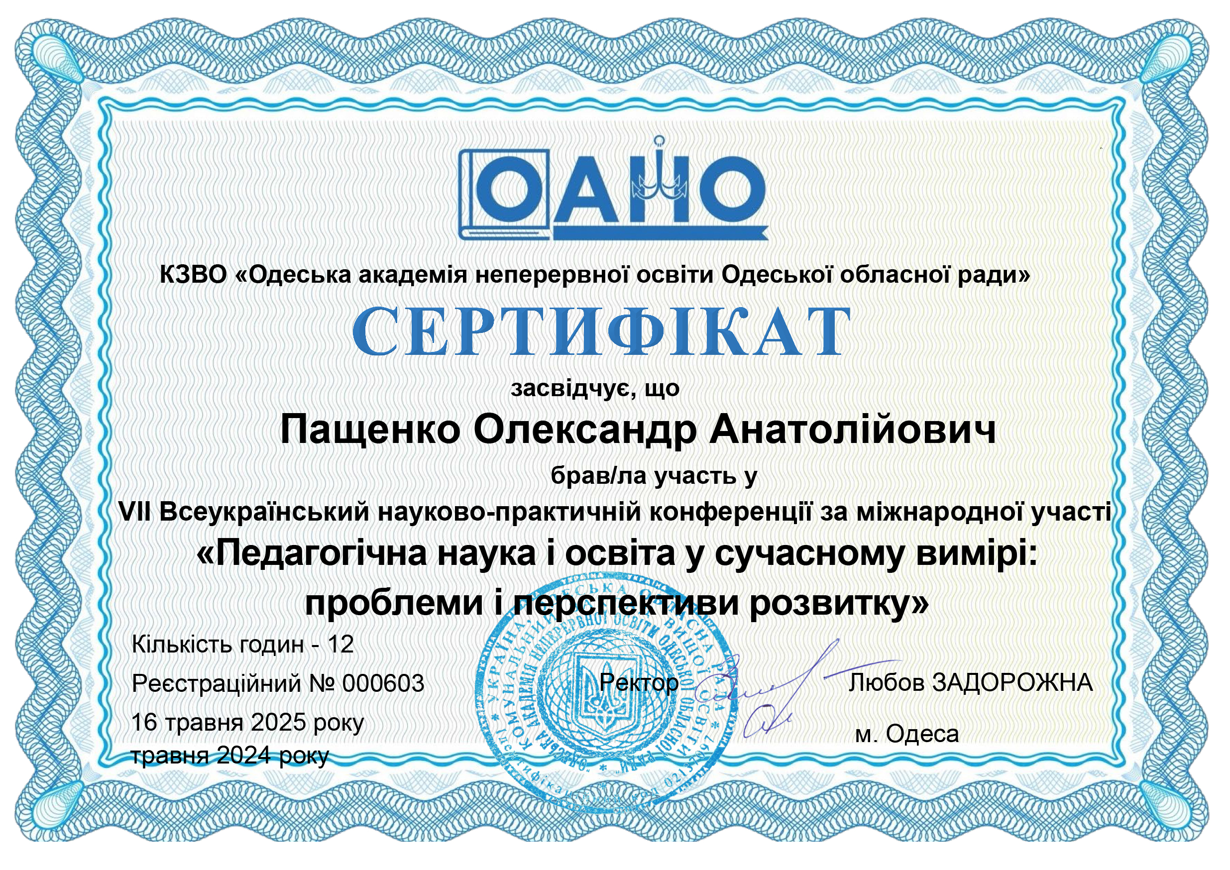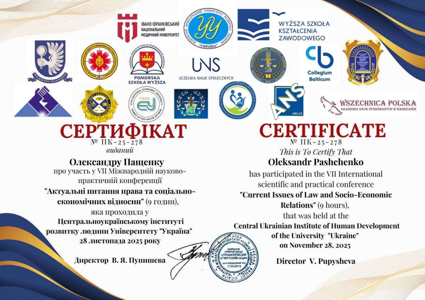 5. NGO Européen Scientific Plotform (Vnnytsio. Heroine) LLC Internotionol Centre Corporative Monogement (Vienno. Austria); Сертифікат GS170223-167, 17.02.2023; тема: «SCIENTIFIC RESEARCHES AND METHODS OF THEIR CARRYING OUT: WORLD EXPERIENCE AND DOMESTIC REALITIES»; кількість кредитів – 0,3 (9 годин).