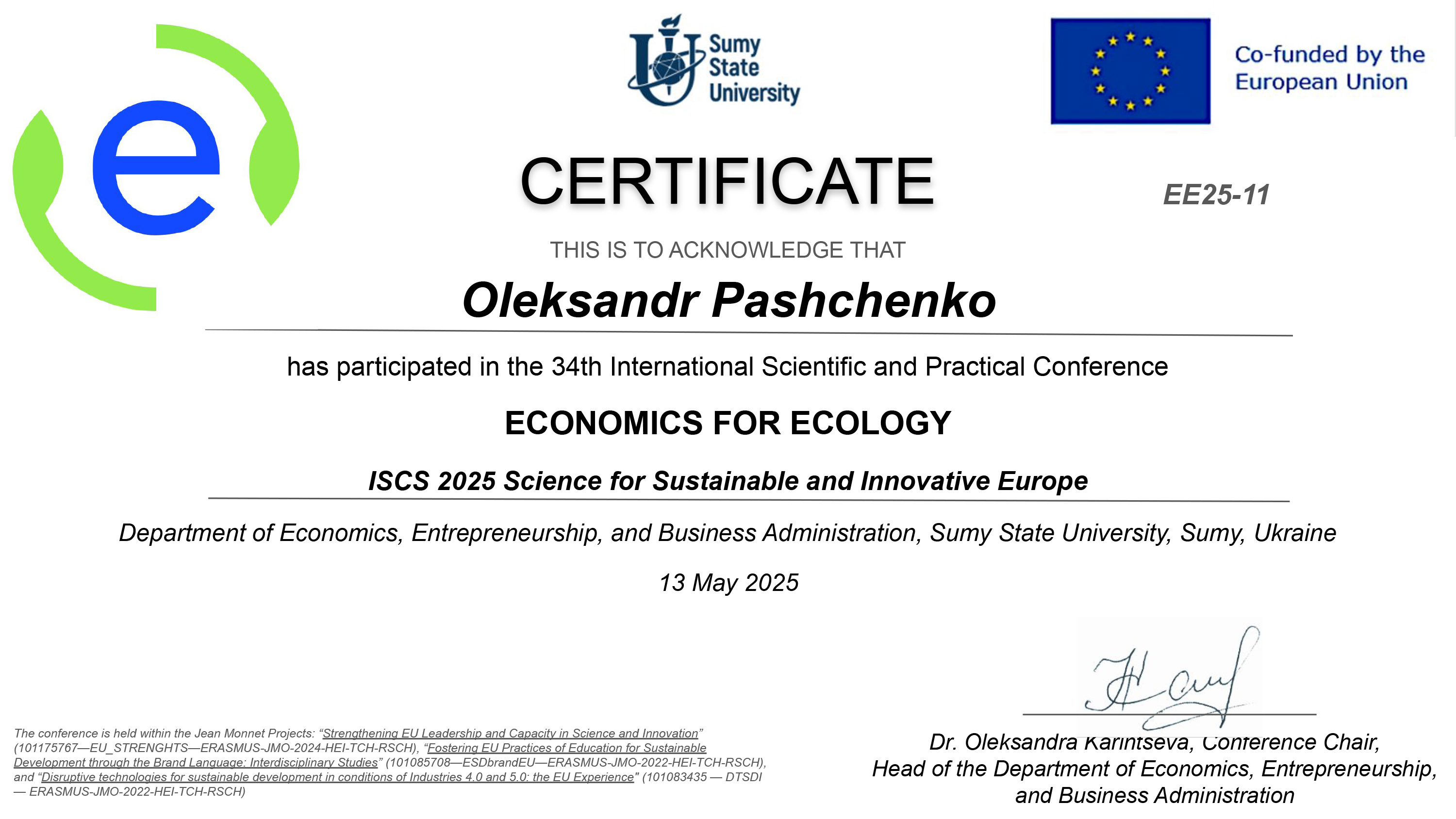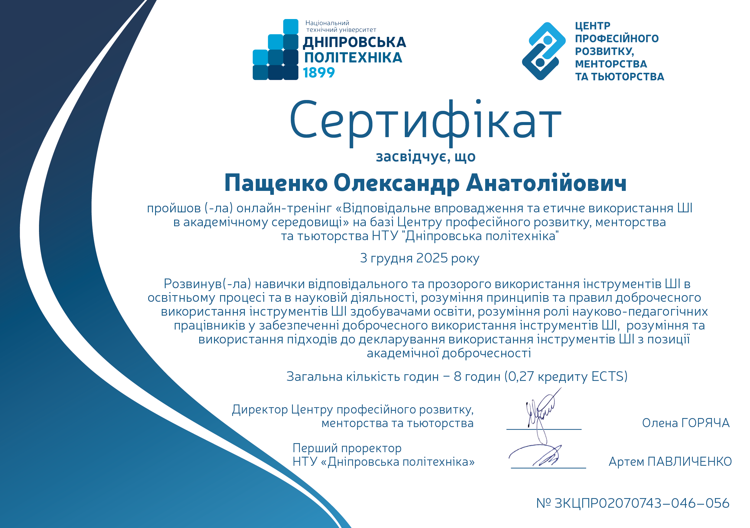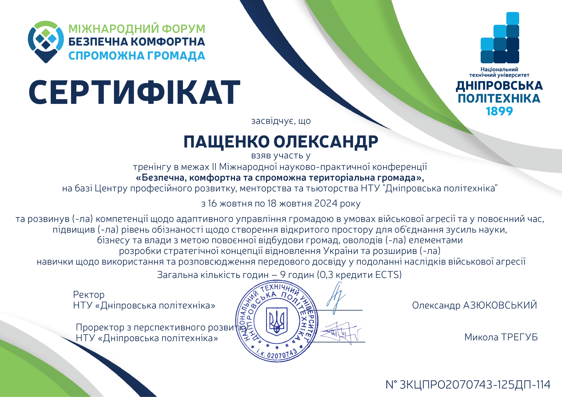 4. Центр професійного розвитку персоналу НТУ «ДП»; Сертифікат ЗКЦПРО2070743-009-099, 28.09.22-29.09.22; тема: «Сталий розвиток підприємств на основні ефективної практики використання чинних норм законодавства»; кількість кредитів – 1,0 (30 годин).