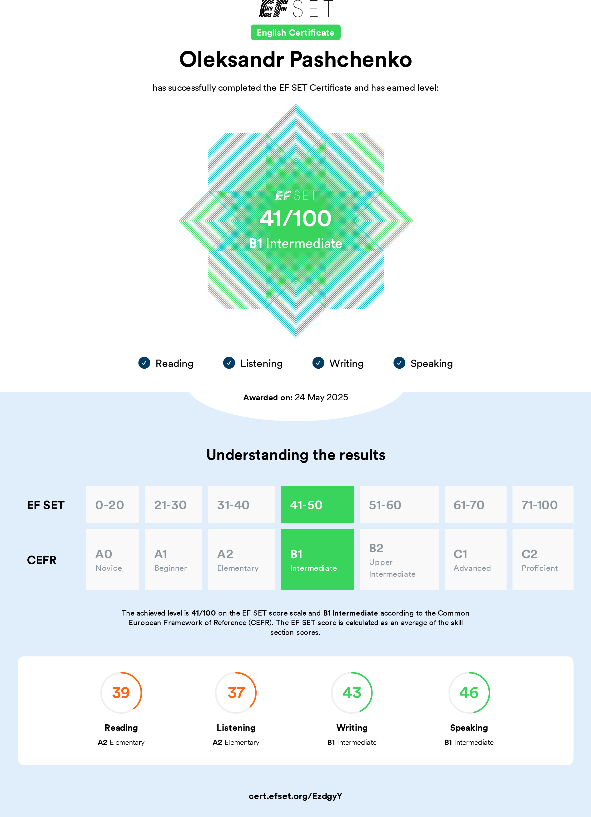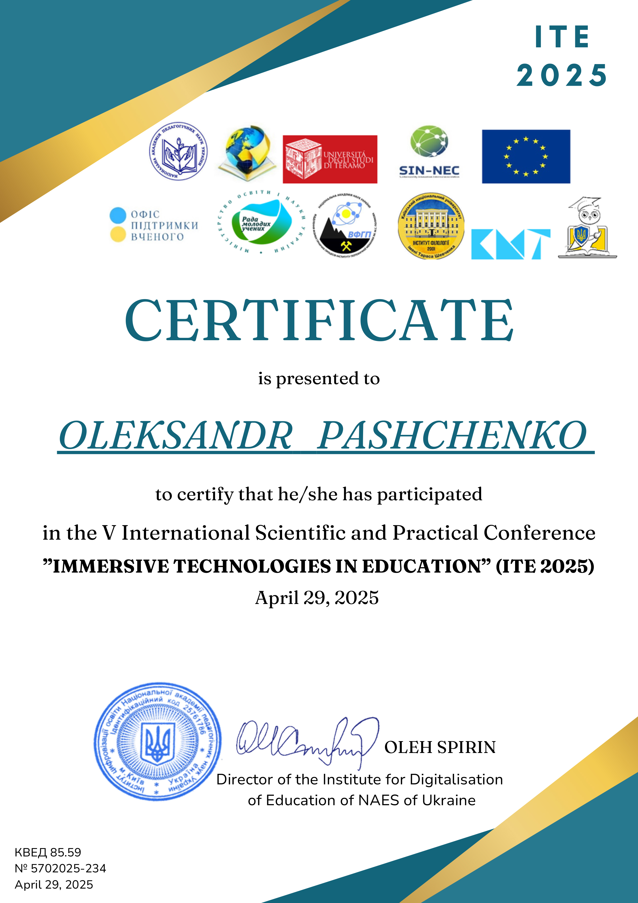 1. TECHNISCHE UNIVERSITÄT DRESDEN; Сертифікат DT2022016, 18.10.22-14.12.22; тема: Professional Development Online Training Course «DIGITAL TEACHING»; кількість кредитів – 3,0 (90 годин).