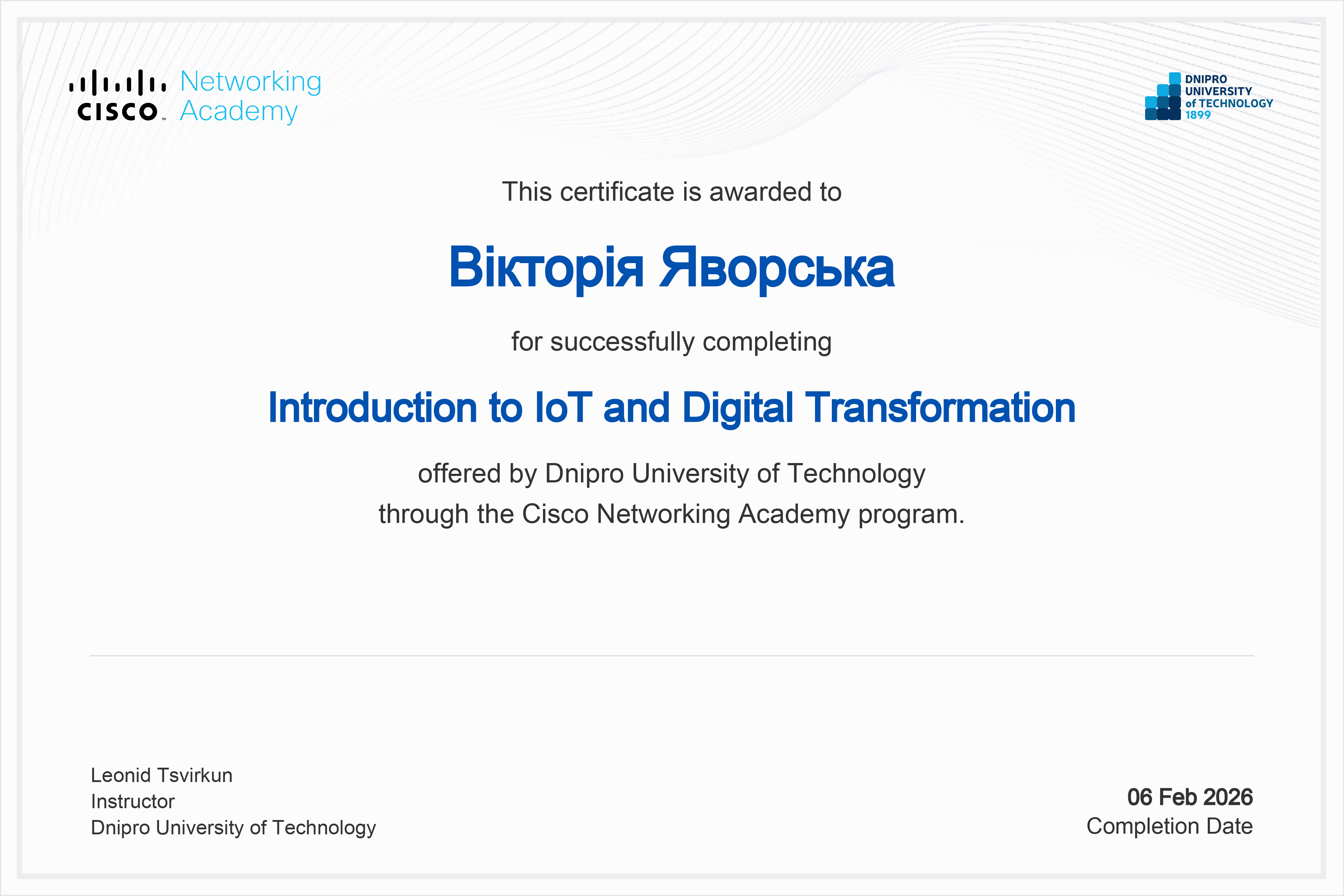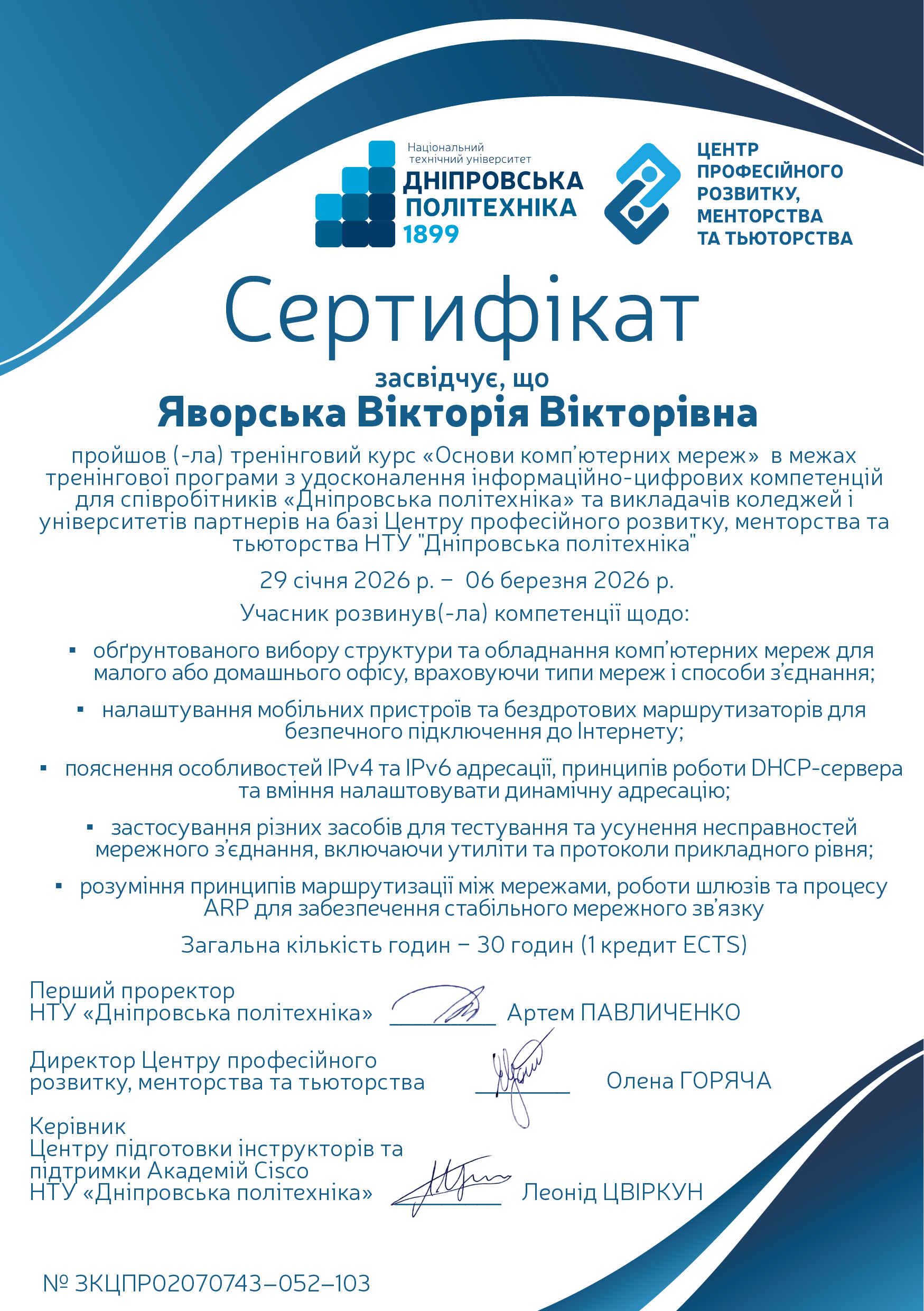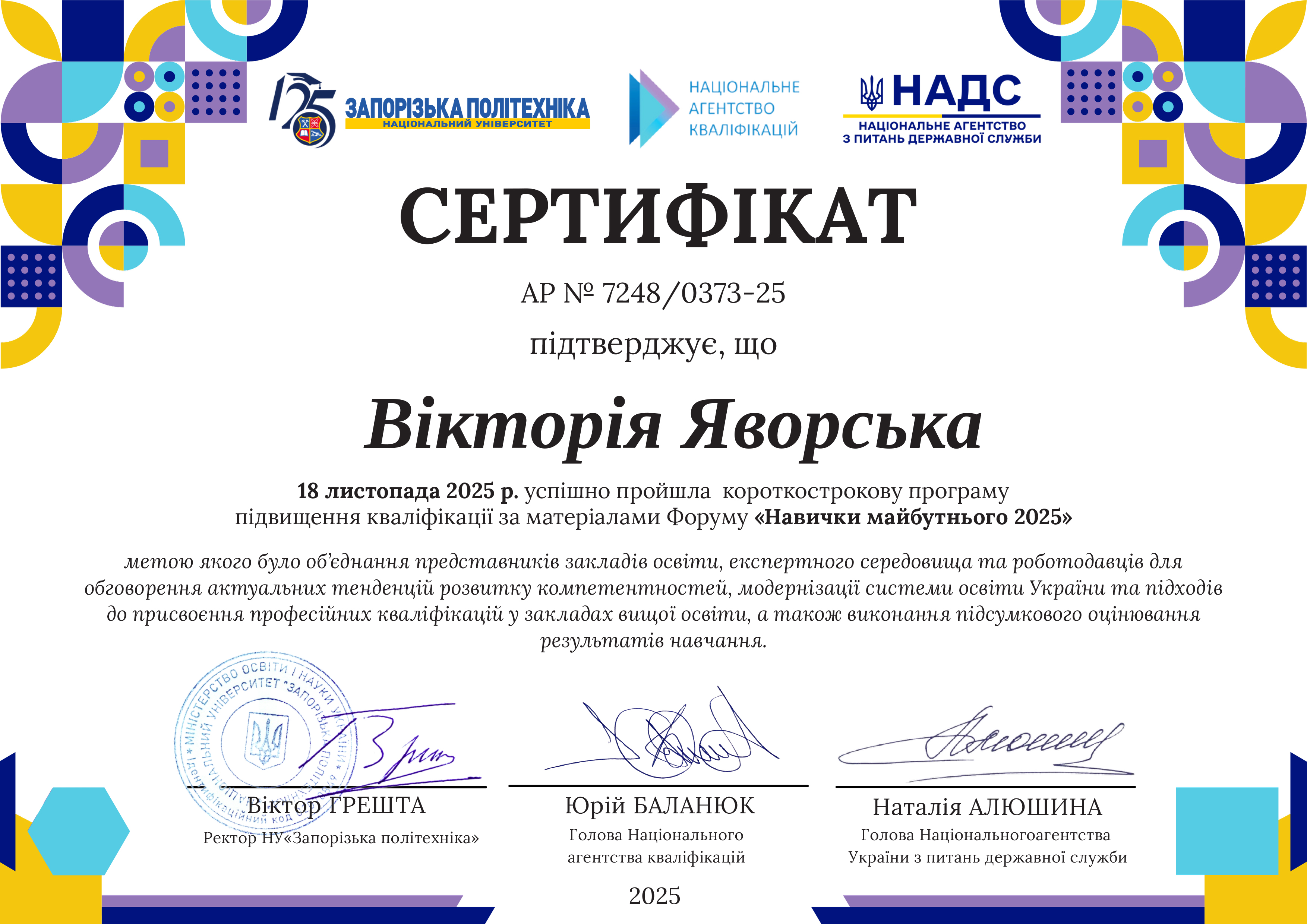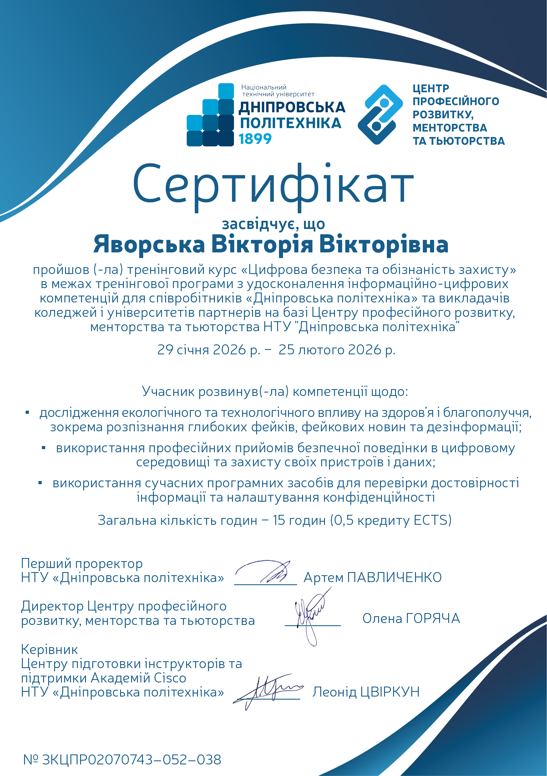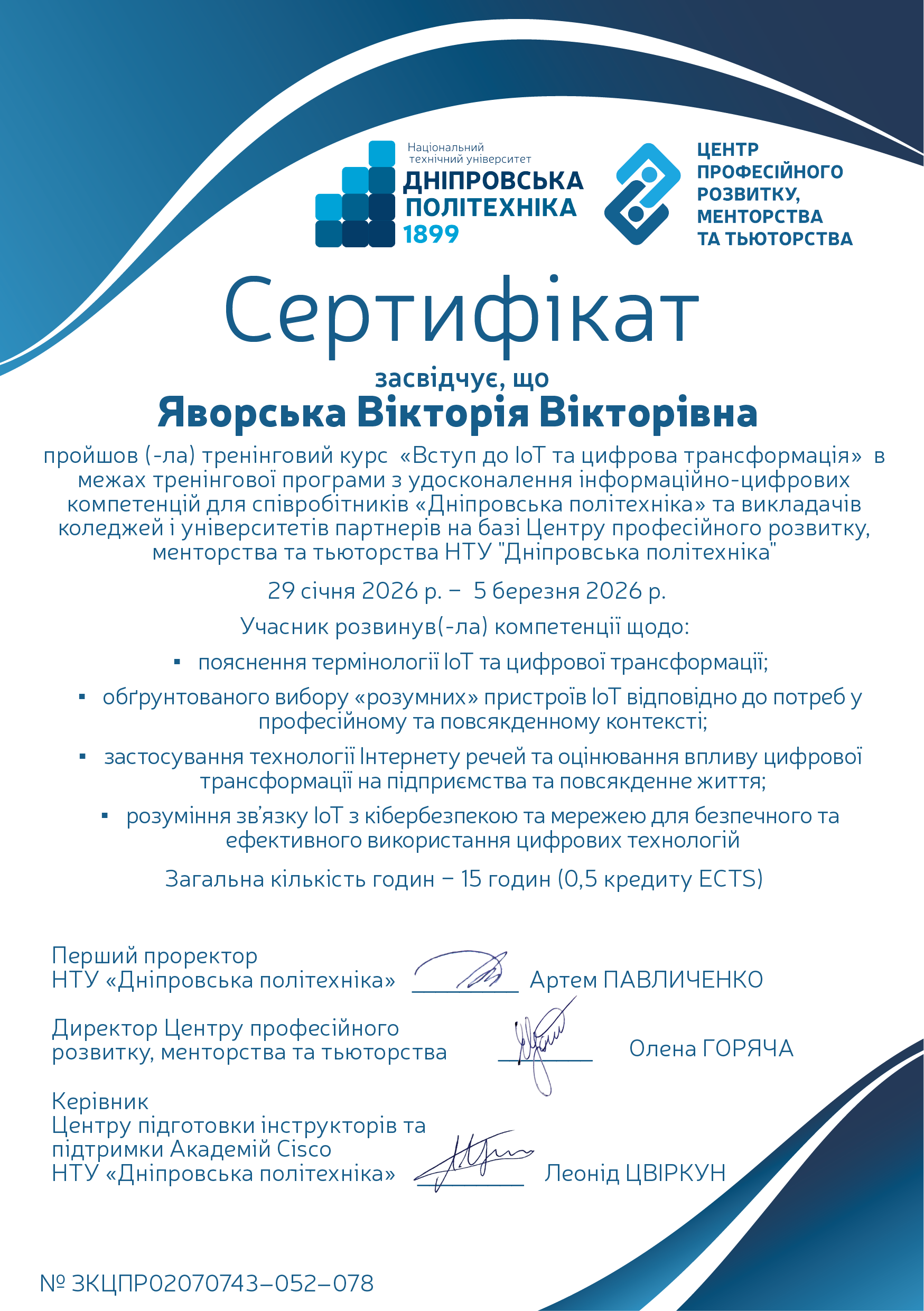 1. EPAM Systems, Kyiv, Ukraine; Certificate # 1076, August-September 2022; IT Ukraine Association Teacher's Internship Program; Credits of ECTS - 6 (180 hours).
