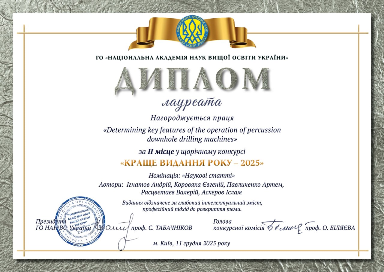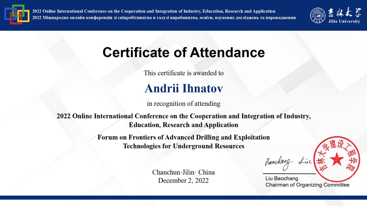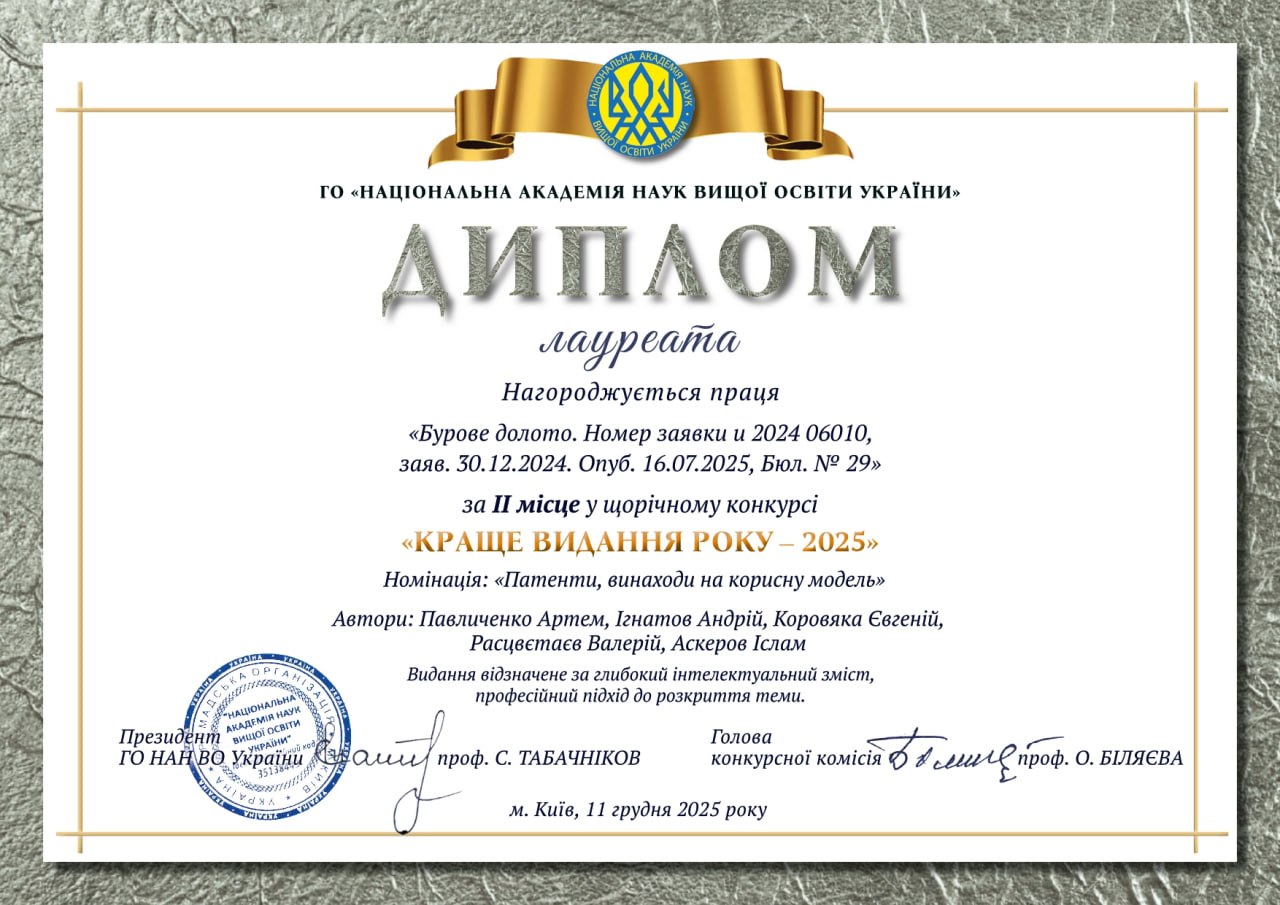 Кандидат технічних наук 05.15.10 – «Буріння свердловин» (2017), ДК №045426. «Обґрунтування параметрів технології і технічних засобів підготовки стовбура свердловини до цементування обсадної колони».