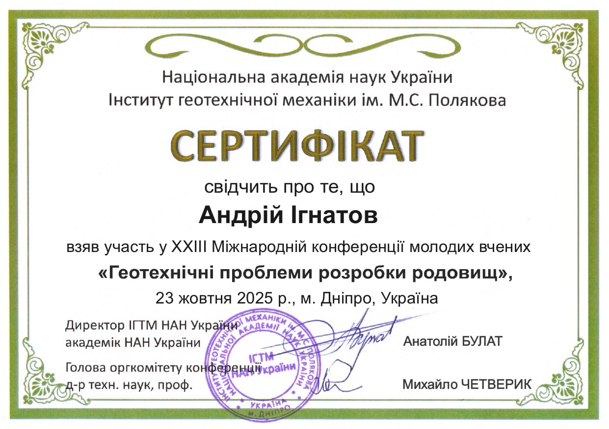 2. Товариство з обмеженою відповідальністю «Укрспецстройбуреніє»; довідка про підвищення кваліфікації № 27/4 від 07.06.2021 р; тема: «Набуття поглиблених професійних знань та фахових навичок з буріння свердловин різного призначення з урахуванням специфічних особливостей гірничої й геологорозвідувальної галузей в умовах Європейської інтеграції» (наказ № 27/4 від 14.04.2021 р.); кількість навчальних кредитів – 6 (180 годин).